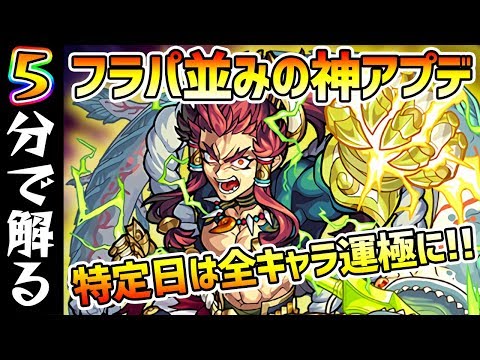 【5分で解るモンストニュース】特定日は全キャラ運極扱いになる神アプデ!超爆轟もノーコン報酬が金卵に、さらに条件を満たせば宝箱3つに!そしてタケミカヅチの獣神化が決定!【けーどら】